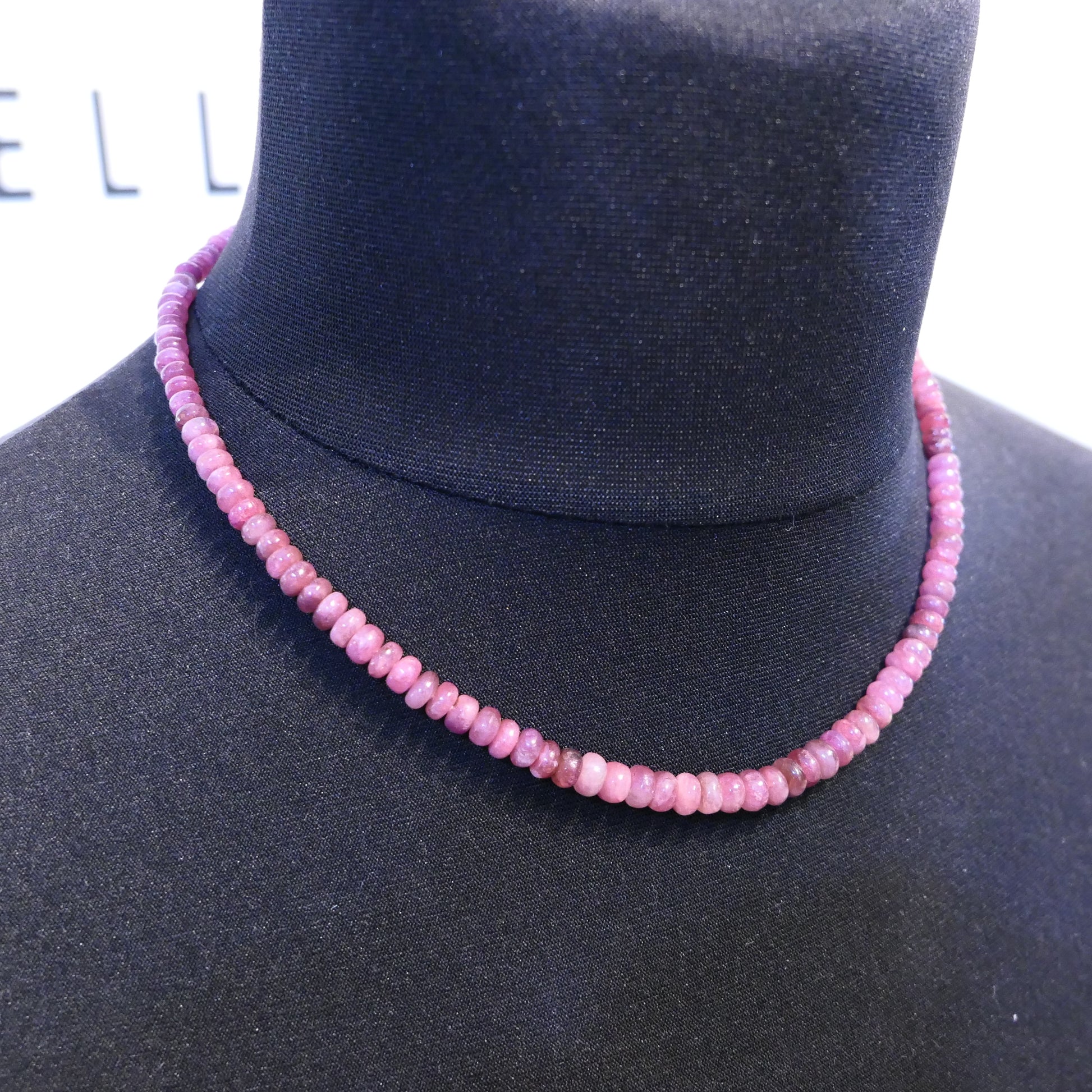 A lovely row of Ruby Beads in Rondelle shapes. These beads taper in size, biggest at the front and smallest at the back, strung to a typical length of 18". Bright mixed Red and Pink Hues, these are Natural Rubies which are commonly heated to bring out the colour. They are not glass filled!