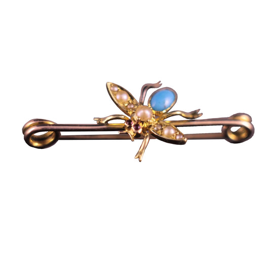 Antique 9ct Edwardian Insect Fly Pin Brooch Pearl, Turquoise & Ruby