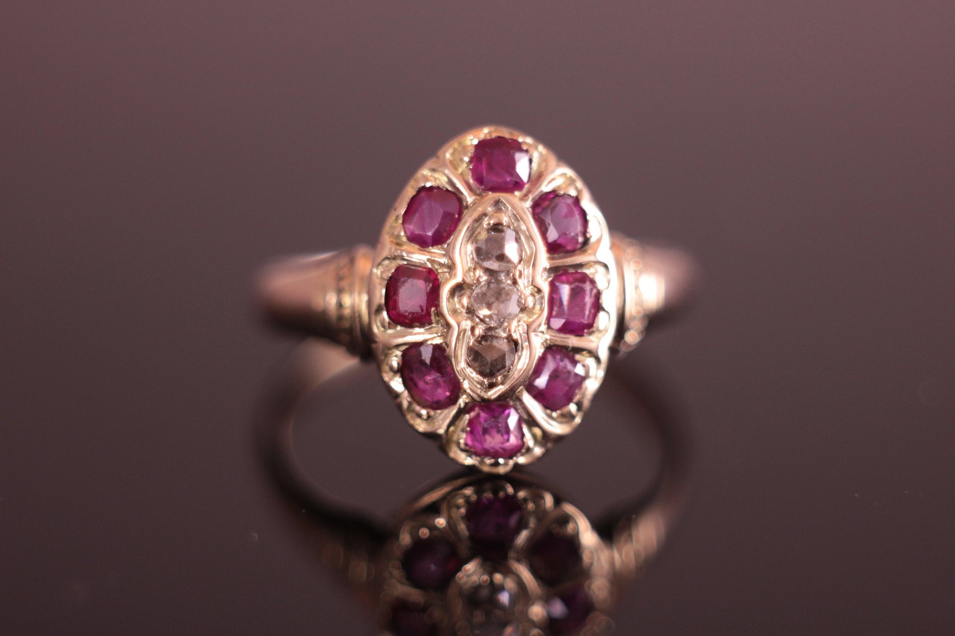 Ruben König Jewellery presents this Early Victorian Ruby & Rose Cut Diamond Ring. The Rubies have been faceted in a 'Brilliant' style with triangular facets, Old Cut. The Diamonds are Rose Cut, helping to date the piece as Early Victorian C.1850 - 1870 roughly.