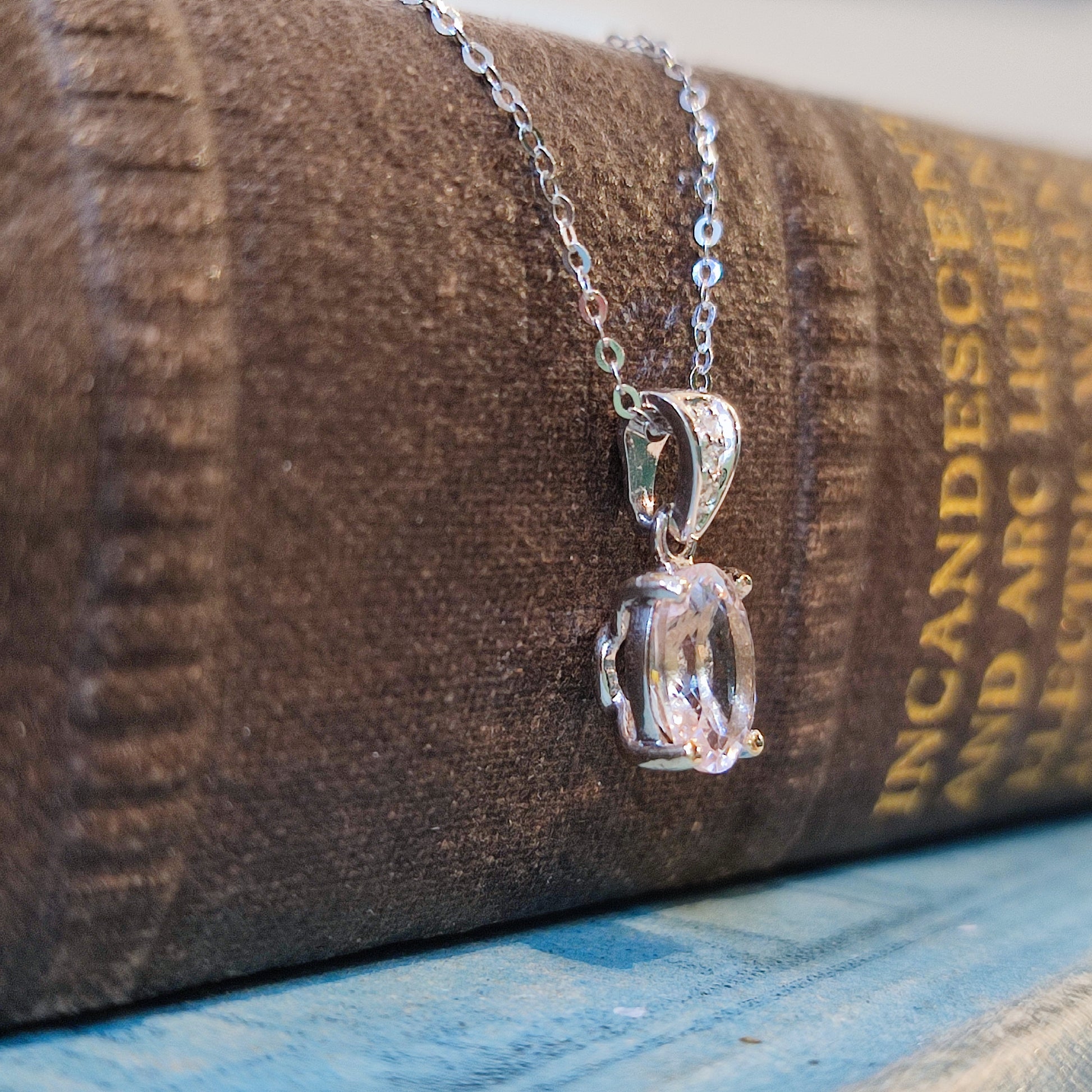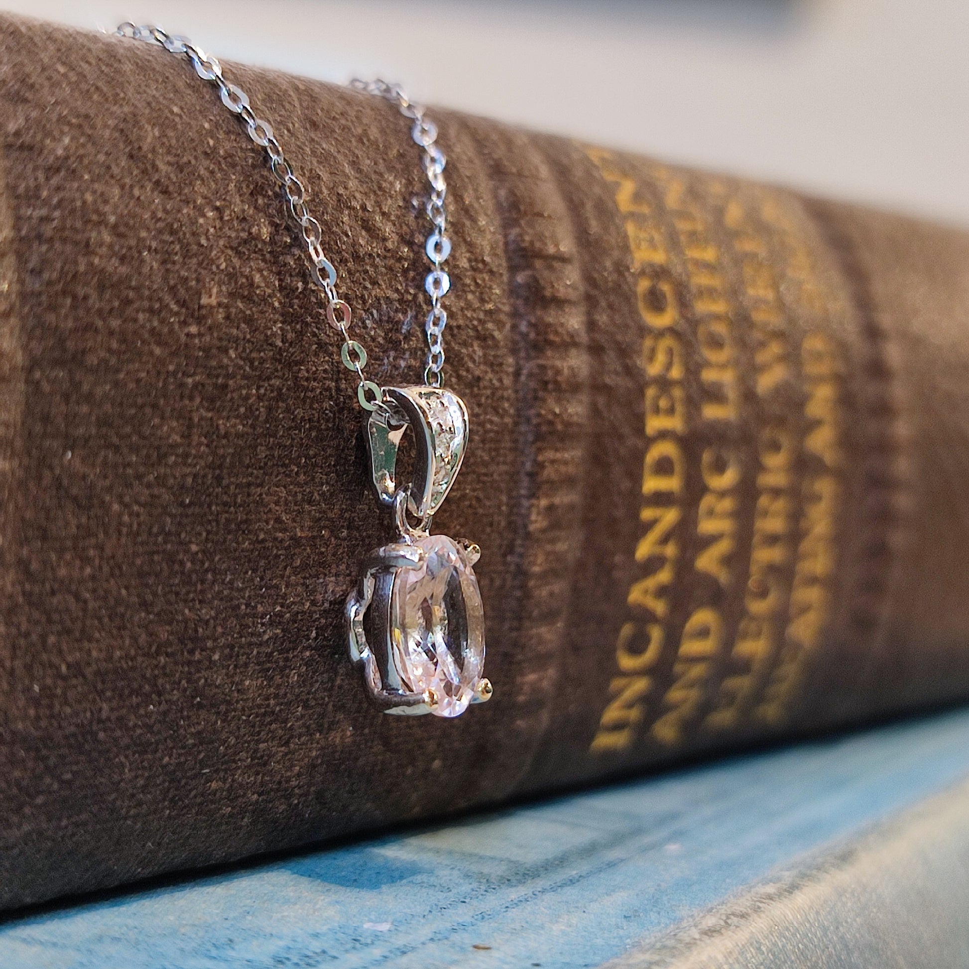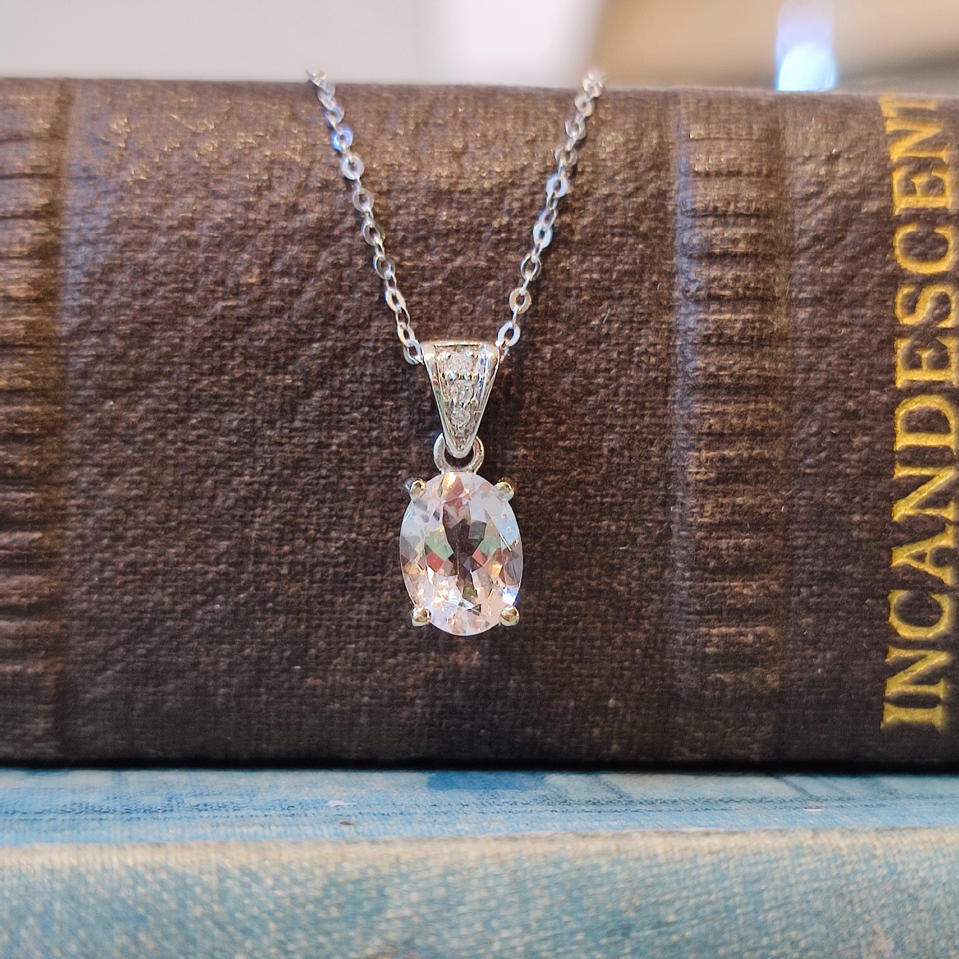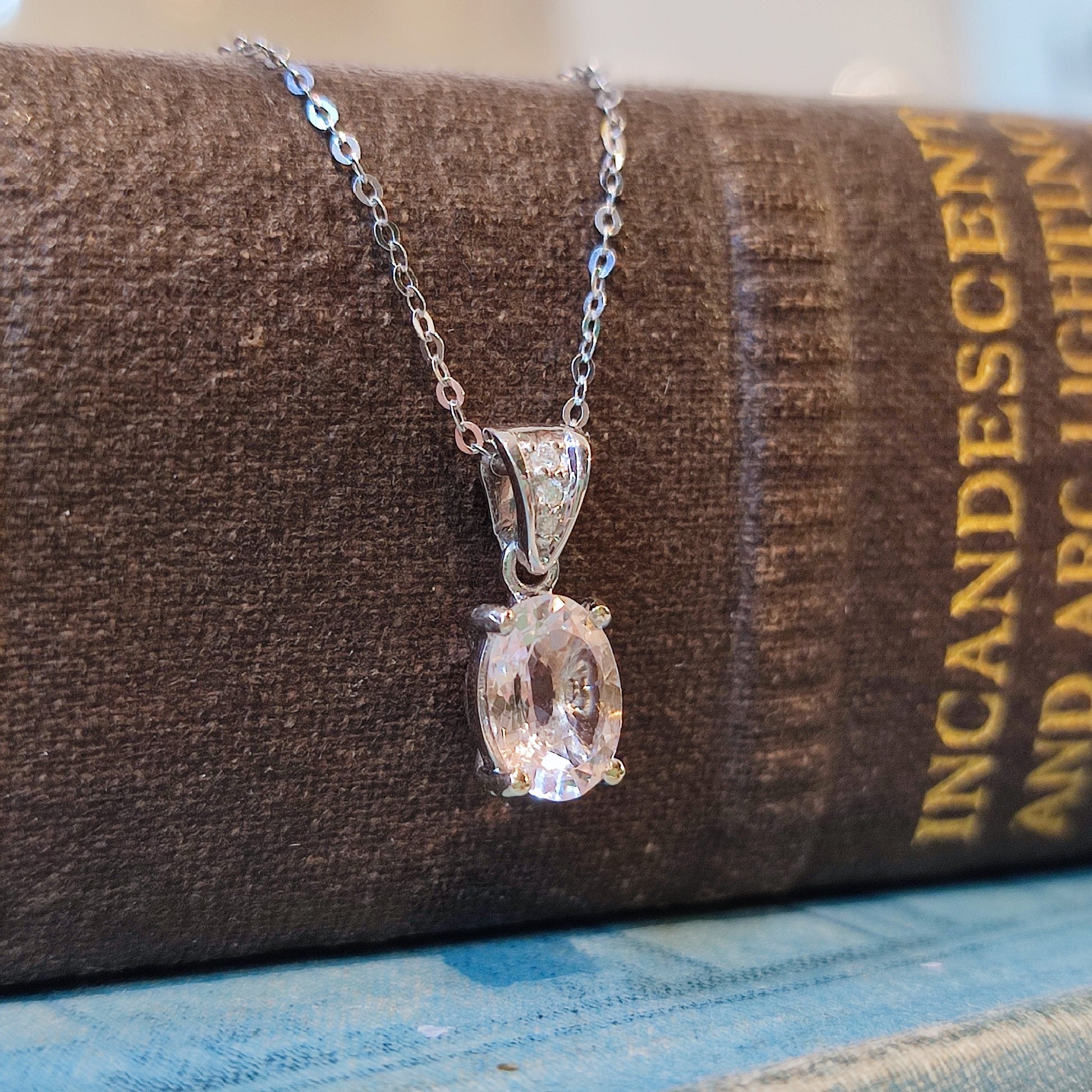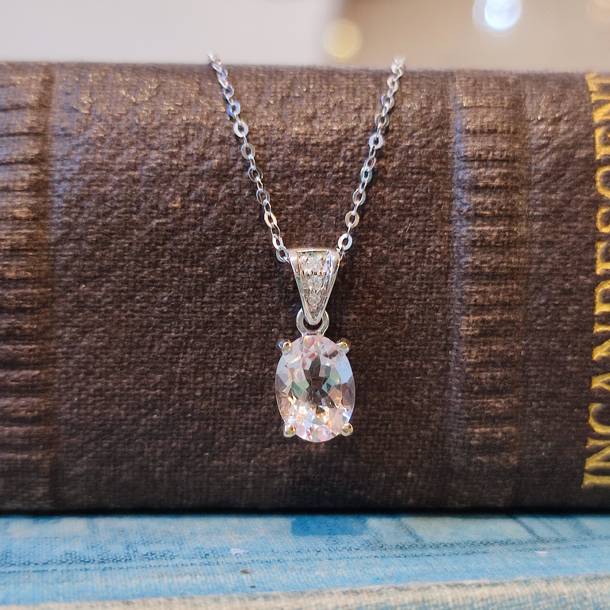 A cute little Morganite and Diamond pendant set in 18ct White Gold. The piece is a vintage mount with a new Morganite and chain. The diamonds are set in a pave method and just give a small touch of sparkle. The perfect finishing touch to any outfit, understated and contemporary.