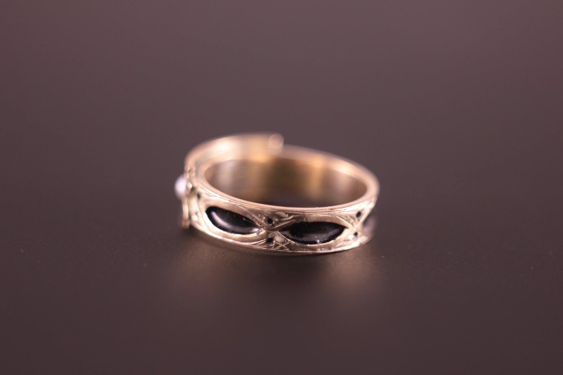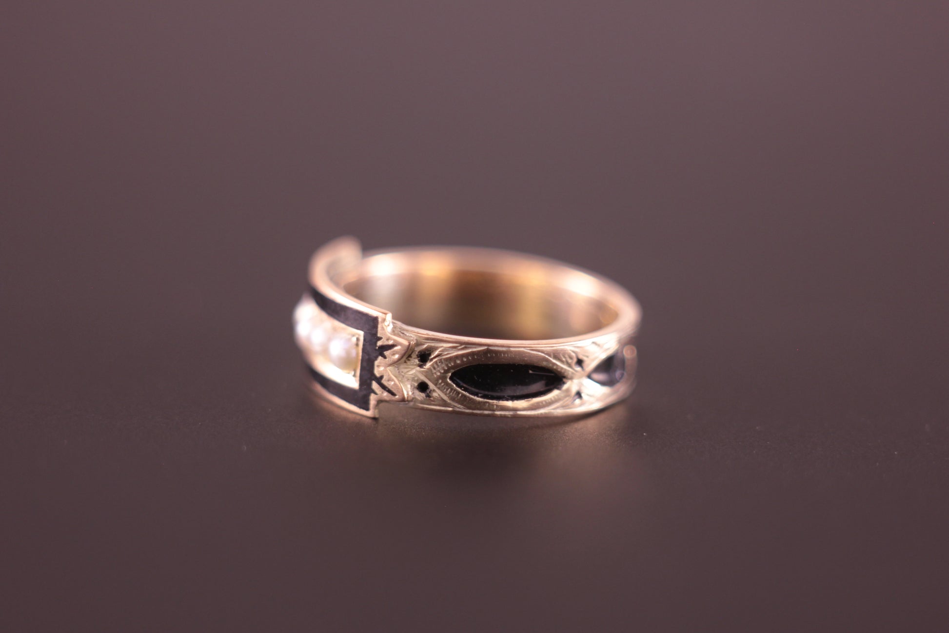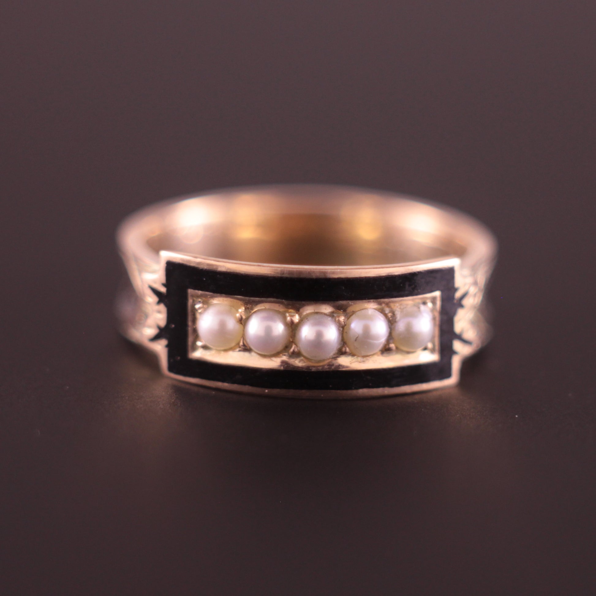 Antique Dated 1888 Memento Mori Mourning Ring Gold with Black Enamel & Pearl