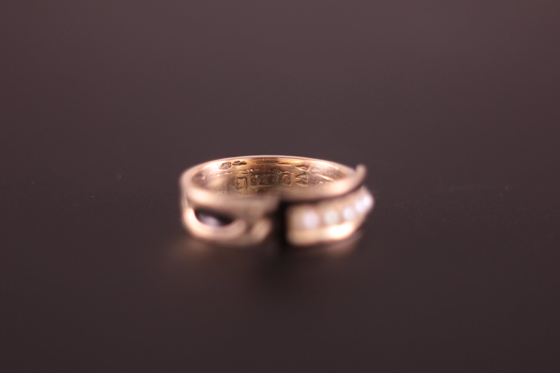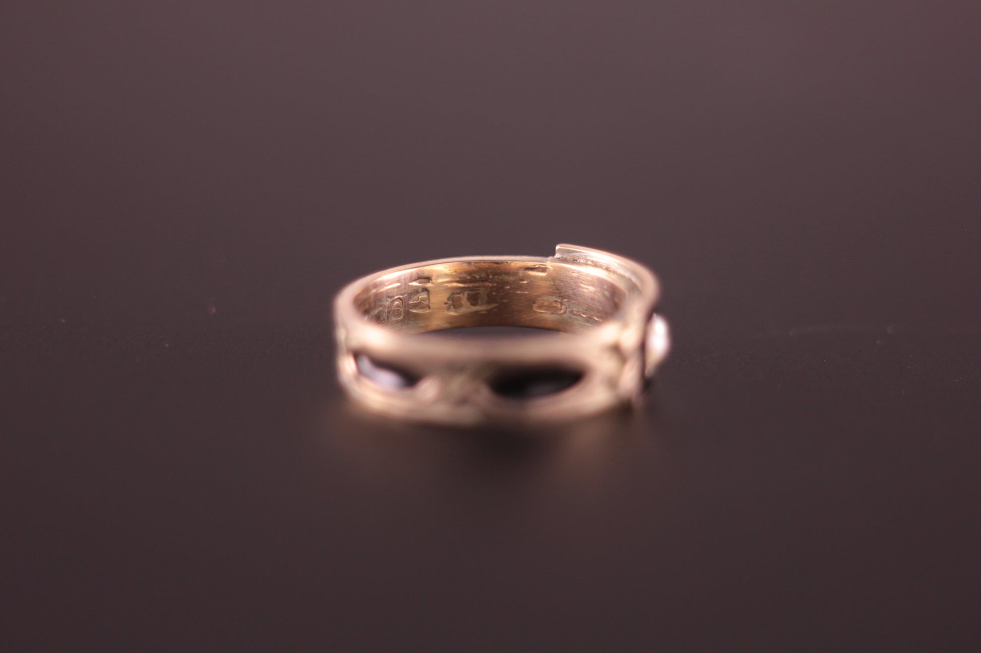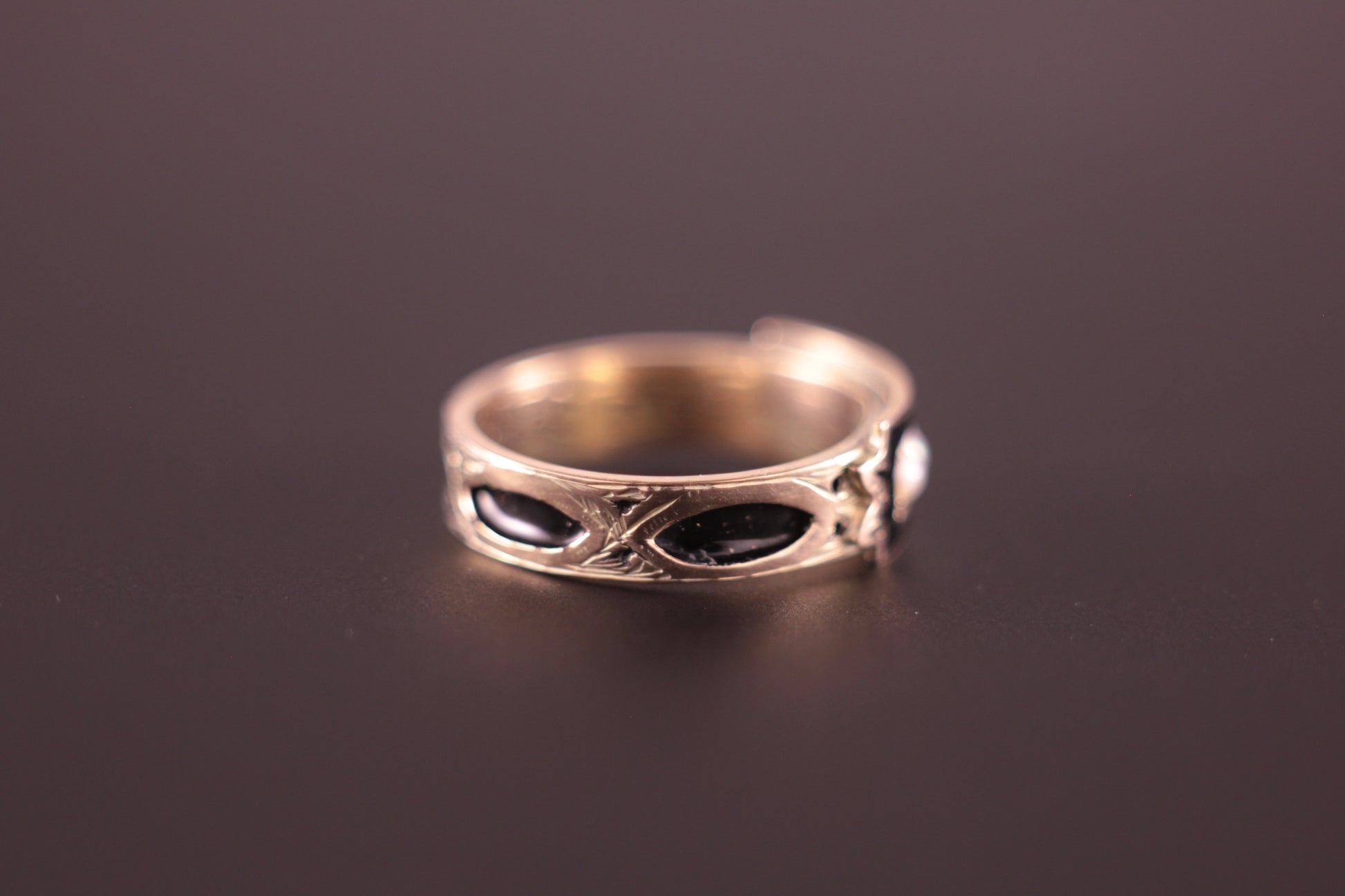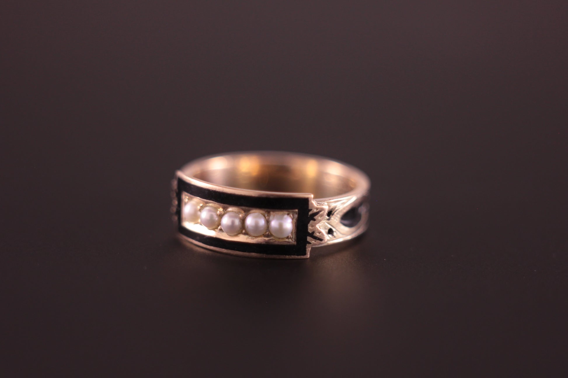 Ruben König Jewellery presents this important Momento Mori ring dated by its hallmark as 1888 Chester, UK. The piece features 5 grain set half pearls in a line surrounded by a black enamel border. The piece originally would have had hair woven into the gaps but it was missing when we acquired it so we have had it professionally restored and filled these gaps with Black (cold) enamel. The piece looks fantastic and is ready for its next owner.